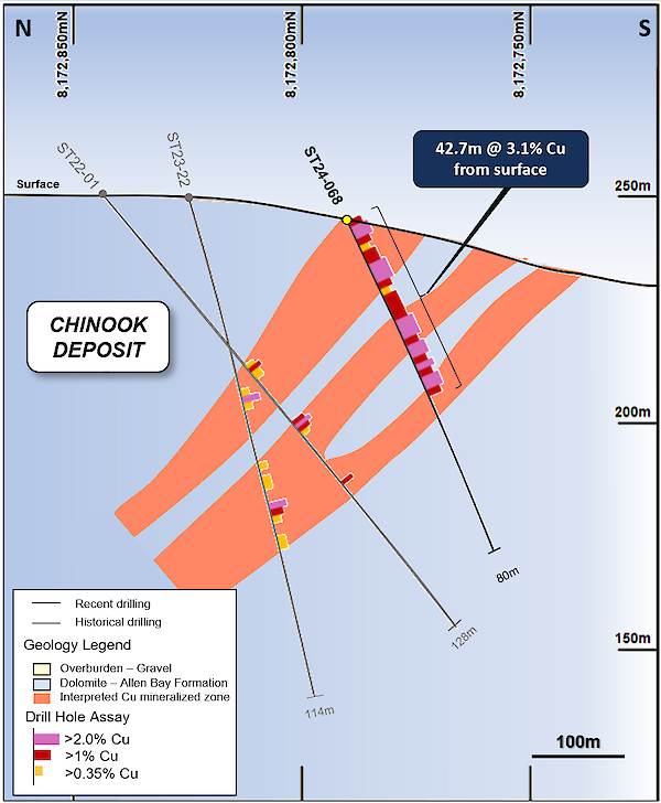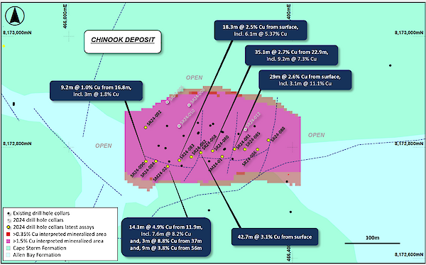 Assay results from drilling at the Chinook Deposit confirm thick and high-grade intersections of copper from the surface and highlight the near-surface, high-grade potential of the deposit (Figure 2). The drill program was designed to inform an upcoming maiden mineral resource estimate for the Storm Project that is currently being constructed to CIM standards.
