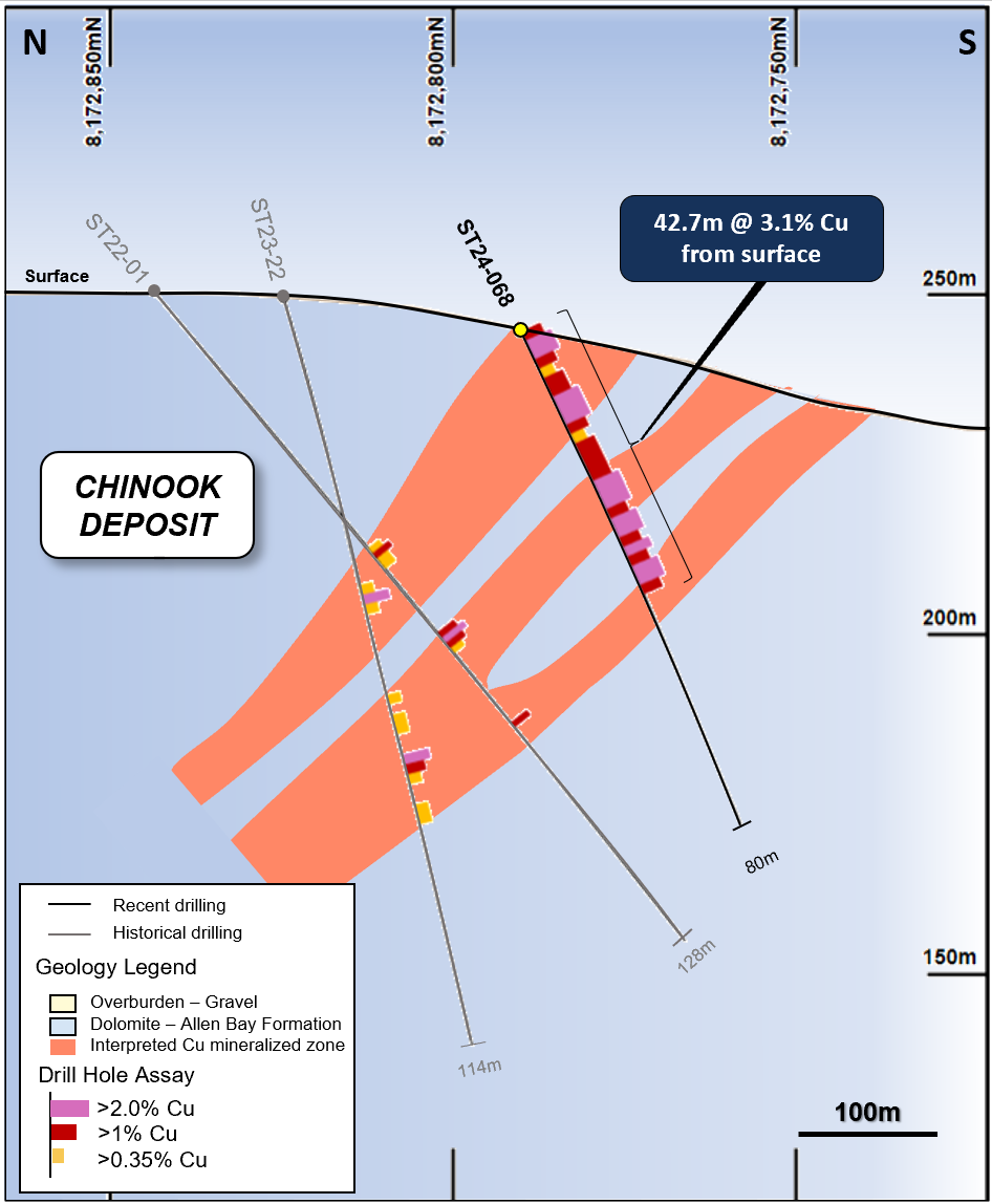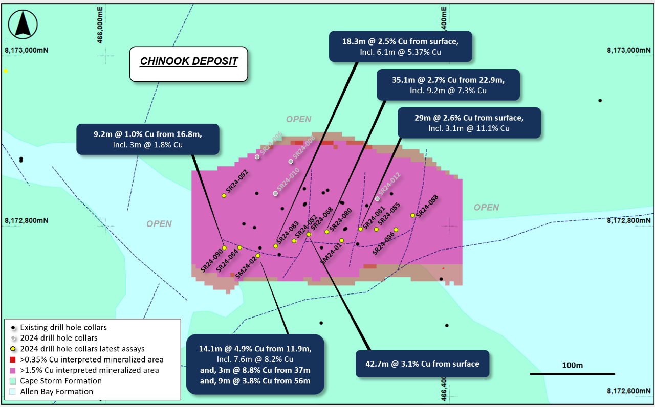 SR24-068 was drilled in the up-dip portion of the Chinook Deposit to a downhole depth of 79.2m (Figure 4), intersecting 43m of intense chalcocite and bornite mineralization from the surface (Table 1). The interval is consistently mineralized with several discrete zones of more intense mineralization grading up to 7.1% Cu (from 25.9m downhole).