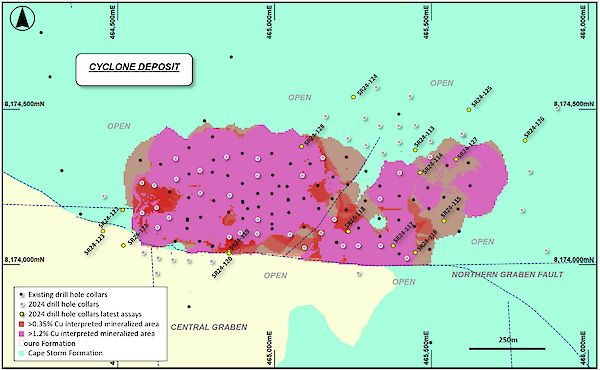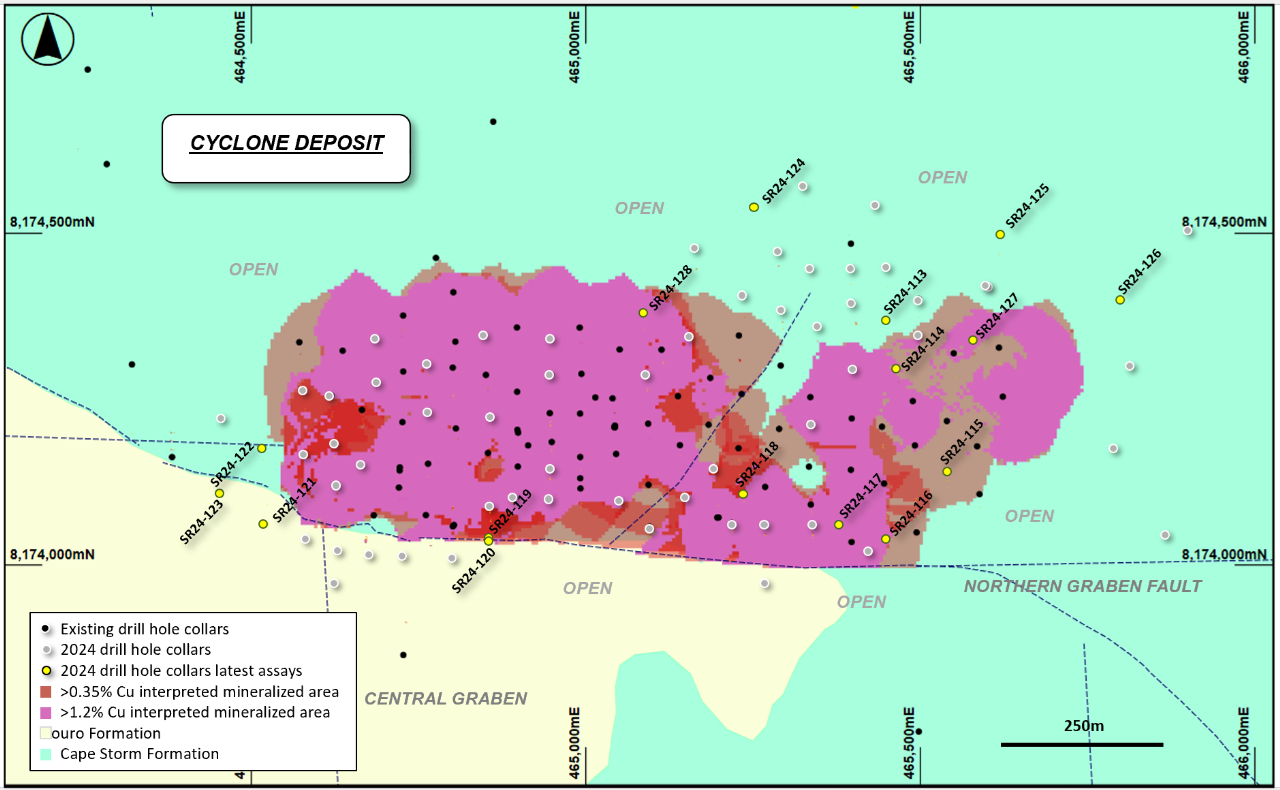 Recent drilling has also hit significant copper mineralization outside of the interpreted zone of copper mineralization at Cyclone. Previous geological interpretations truncated the zone along the Northern Graben Fault (Figure 5). Recent drilling to the southwest of the deposit (see September 27, 2024, Aston Bay news release) confirms that the Cyclone mineralization continues across this structure and is located at depth within the down-faulted stratigraphy of the Central Graben, outside of the previously interpreted mineralized body. With only minimal drilling in this newly identified zone to the southeast, this area remains a highly prospective target for future growth (Figure 6).