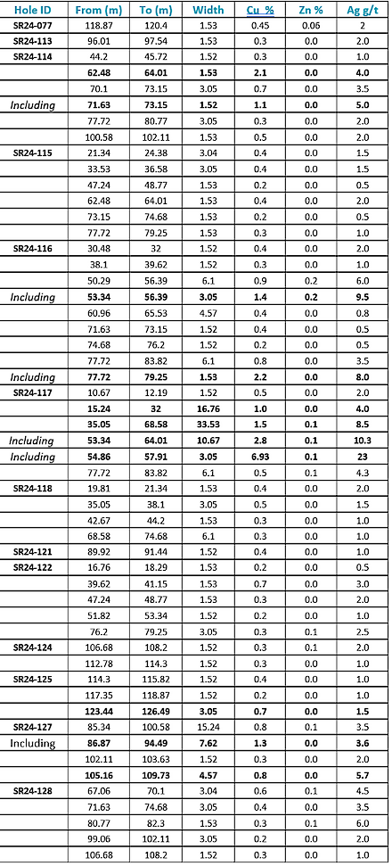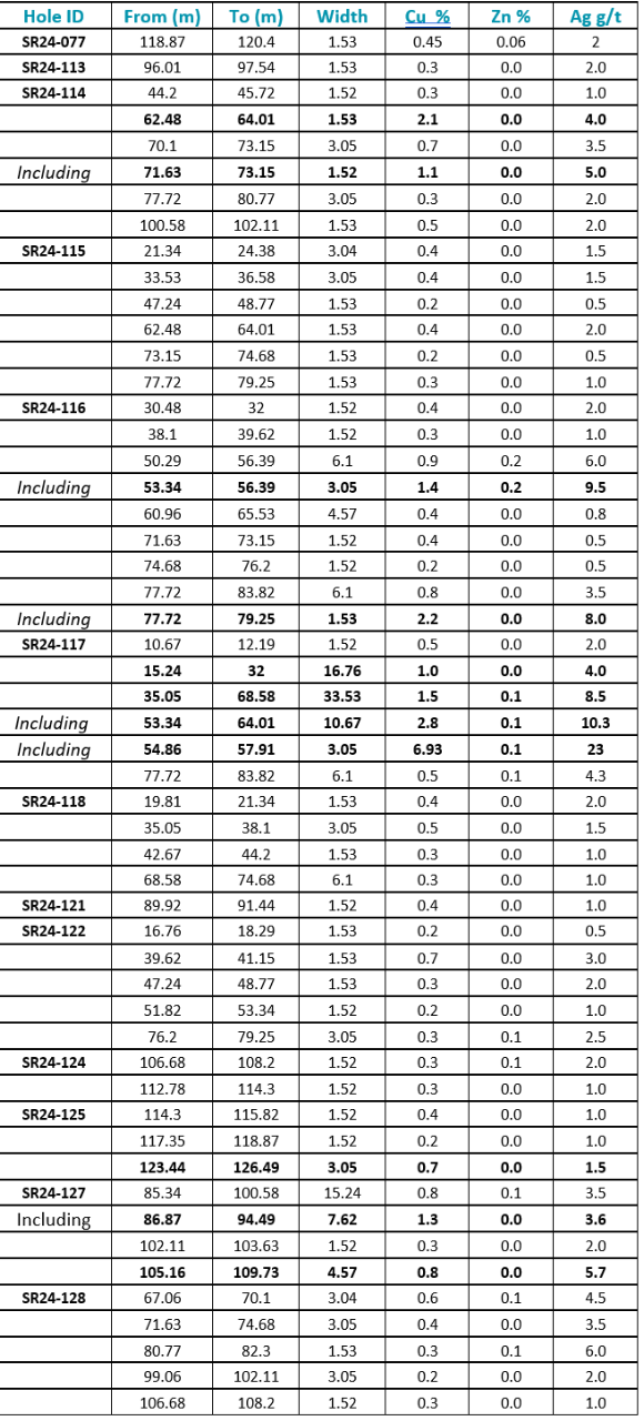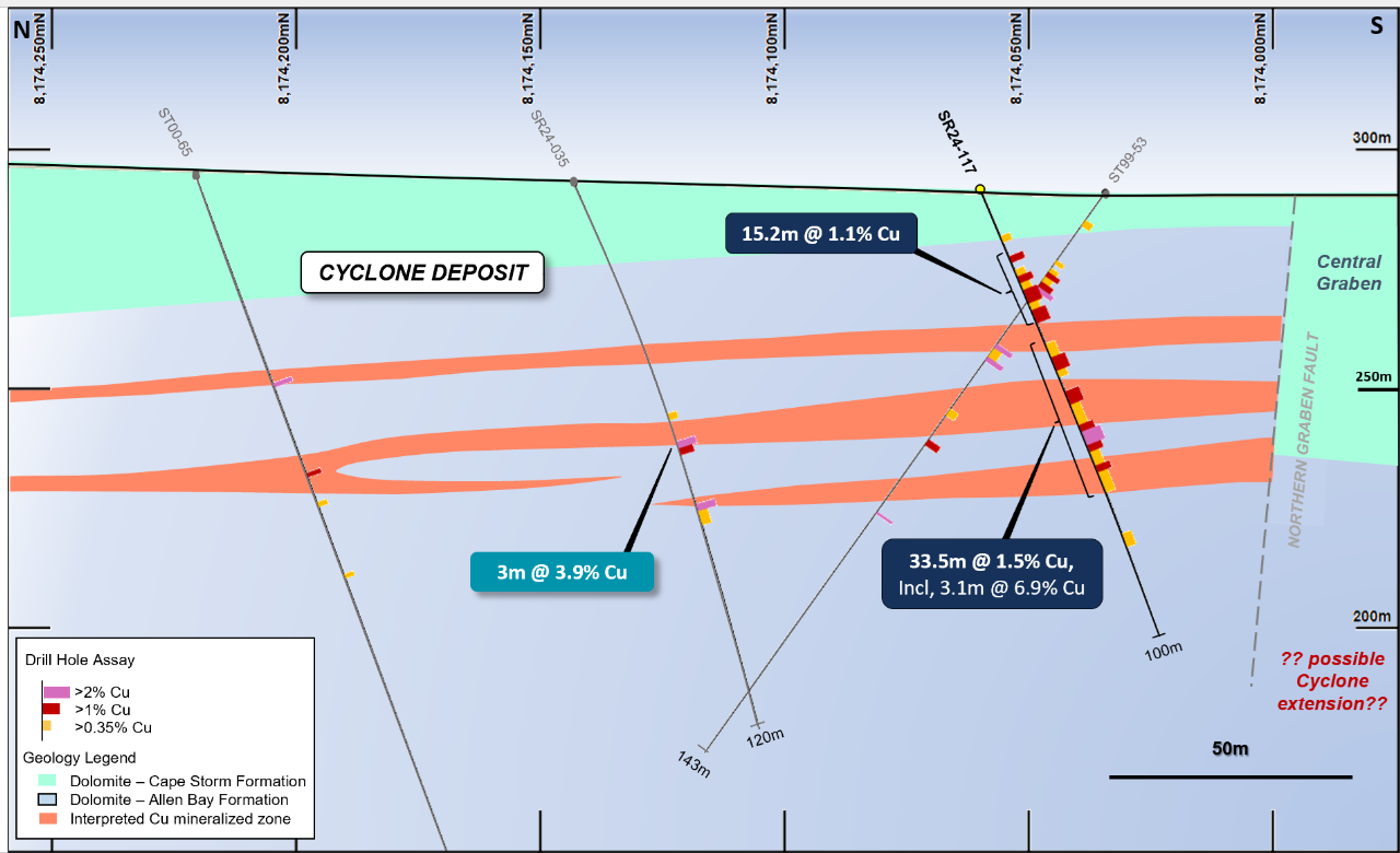 The mineralization in SR24-117 contains two main zones (16.8m @ 1% Cu, 4.0 g/t Ag from 15.2m and 33.5m @ 1.5% Cu, 8.5 g/t Ag from 35.1m) of intense vein- and fracture-style copper sulfide mineralization, dominantly chalcocite, hosted within fractured dolomite of the Allen Bay Formation.
