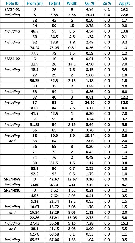 Table 2: Summary of recent significant drilling intersections at the Cyclone Deposit (>0.2% Cu). The Reverse Circulation (“RC”) intersections (SR24* holes) are expressed as downhole widths and are interpreted to be close to true widths.