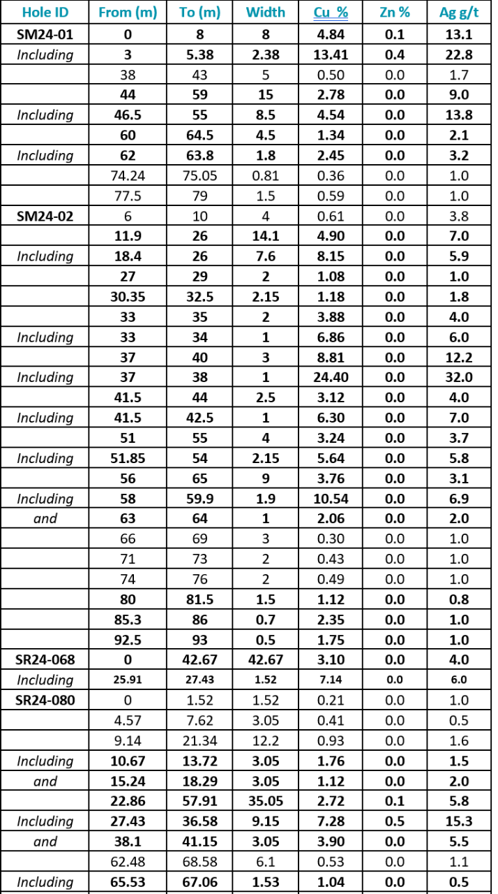 Table 1: Summary of recent significant drilling intersections at the Chinook Deposit (>0.2% Cu). The Reverse Circulation (“RC”) intersections (SR24* holes) are expressed as downhole widths and are interpreted to be close to true widths. Diamond drill intersections (SM* holes) are all core length and true width is expected to be 60% to 100% of core length.