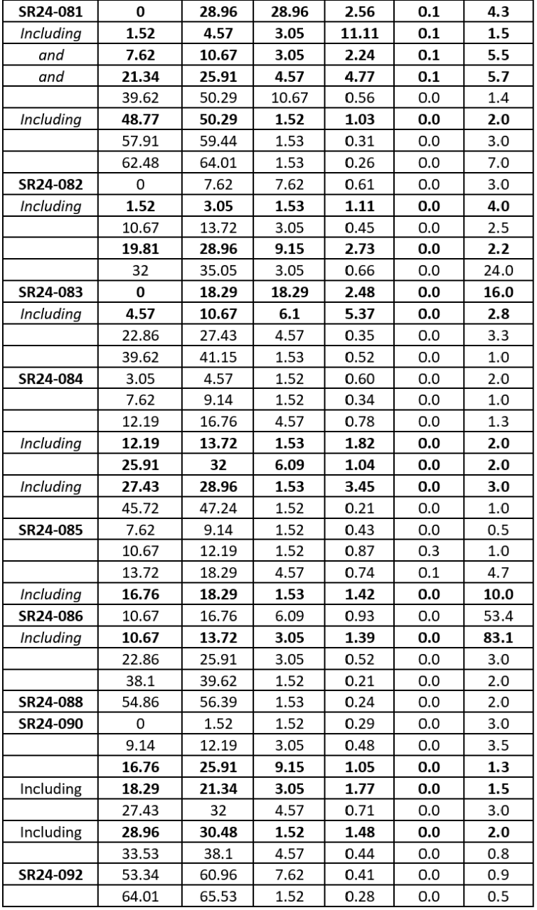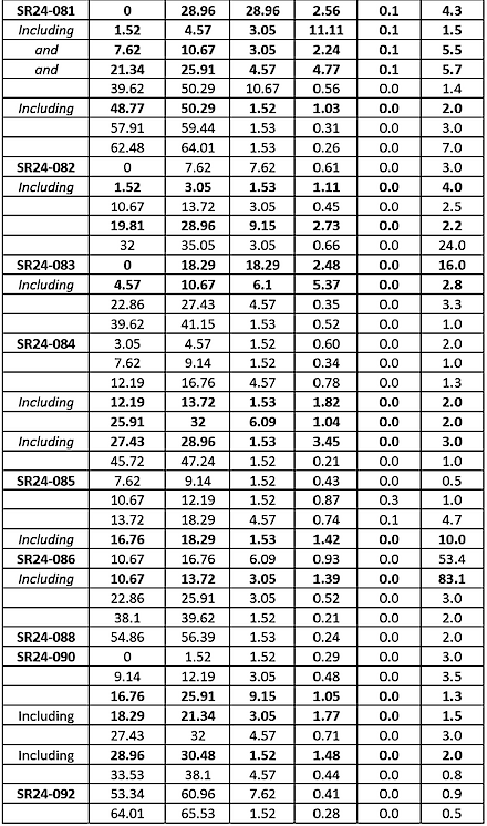 SR24-117 was drilled in the southeast portion of the Cyclone Deposit to a downhole depth of 100.7m (Table 4) proximal to the Northern Graben Fault.