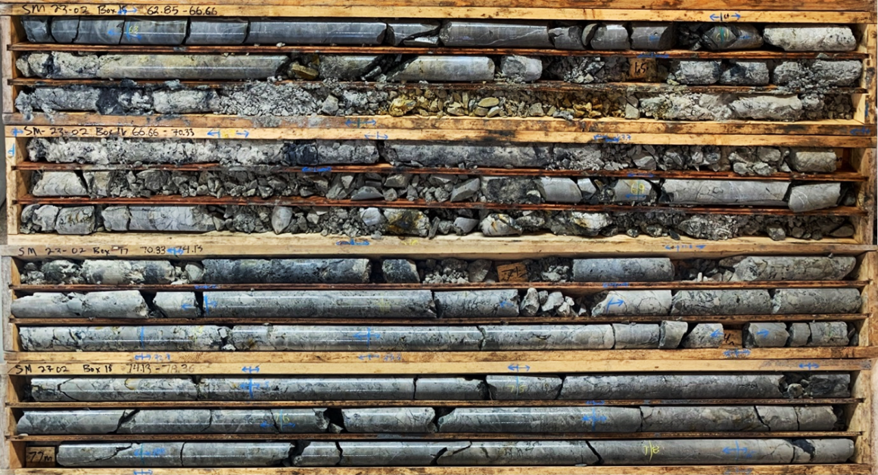 Figure 1: Drill core from resource diamond drill hole SM23-02 from the 4100N Zone showing chalcocite (dark grey)