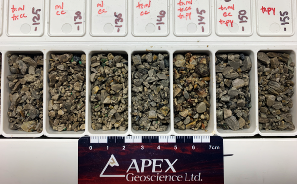 Visual estimates of mineral abundance should never be considered a proxy or substitute for laboratory analyses where concentrations or grades are the factor of principal economic interest. Laboratory assays are required to determine the presence and grade of any contained mineralization within the reported visual intersections of copper sulfides. Portable XRF is used as an aid in the determination of mineral type and abundance during the geological logging process.