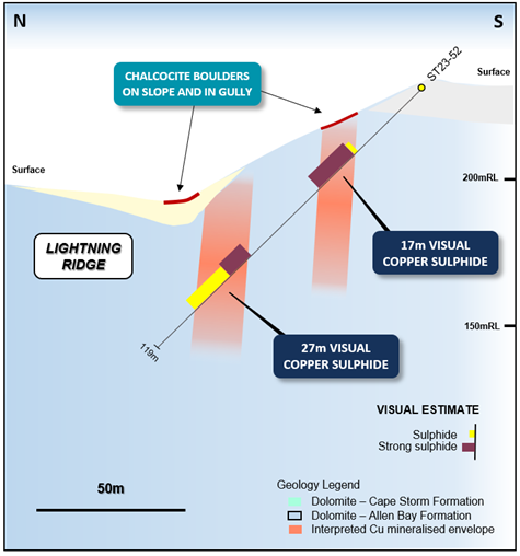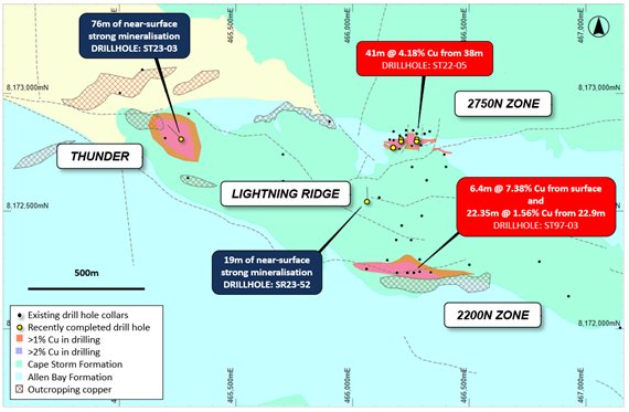 Exploration RC drill hole SR23-52 was drilled to a depth of 119m and completed in a largely untested area of significant outcropping chalcocite (Figures 3 and 4). The drill hole was designed to test an untested airborne VTEM target in an area with a single, shallow historical drill hole (ST97-06 2.6m core length @ 6.83% Cu from 35.4m), midway between the high-grade 2750N and 2200N Zones.