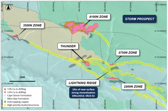 Over 10km of prospective structures have been identified in the southern graben area alone, highlighting the exploration potential along strike, and at depth below the known copper mineralization (Figure 4). The Storm Graben faults can be also traced for over 6km southeast into the Tornado and Blizzard Prospect areas, where there is widespread copper geochemical anomalism at surface as well as significant untested gravity anomalies.