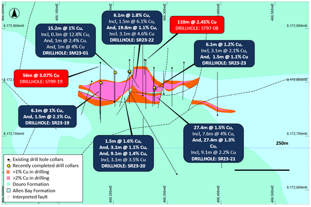 Drill holes SR23-19 and SR23-21 were designed to test the upper, near-surface extensions of the high-grade copper mineralization along key drill sections (Figure 6). SR23-19 intersected an interpreted fault zone along the southern margin of the mineralized trend and confirmed the vertical continuity of the main zone. Drill hole SR23-21 was drilled up dip of 2022 drill hole ST22-05 and has intersected two distinct zones of very strong mineralization, potentially separated by a fault. The presence of faulting along the southern margin and an apparent bifurcation of the mineralization in the southern 2750N Zone may indicate the potential for another parallel zone of mineralization and further prospectivity to the south and east (Figure 6). These two drill holes confirm the extension of the high-grade mineralization to surface.