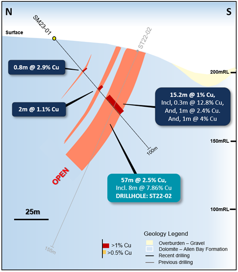 Diamond drill hole SM23-01 was completed for resource infill and QAQC purposes. The drill hole was completed along section 466200E and designed to scissor 2022 drill hole ST22-02 (57m @ 2.5% Cu from 8m downhole). SM23-01 intersected several zones of discreet, chalcocite-dominant mineralization with assay grades up to 12.8% Cu.