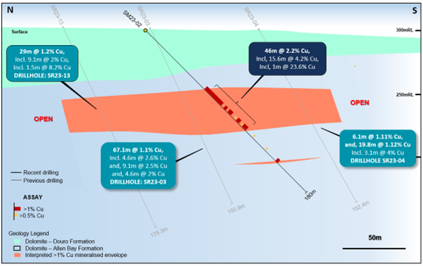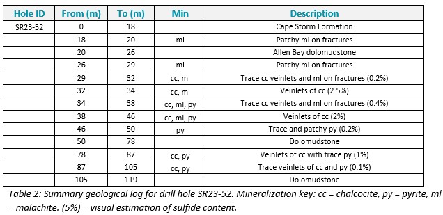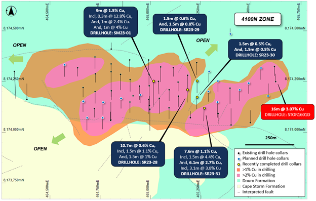 The other three RC drill holes completed within the 4100N Zone (SR23-28, -29 and -30) were drilled in the eastern part of the 4100N Zone and in an area of less brecciation and sulfide veining (Figure 8). This area is characterized by more massive dolomudstone and with chalcopyrite as the dominant copper sulfide mineral. The area may represent a minor facies change in the sedimentary units which is common within sedimentary mineral systems. Historical drilling has confirmed that the copper mineralization re-intensifies to the east of the massive dolomudstone zone (i.e., STOR-1601D intersected 16m core length @ 3.1% Cu from 93m downhole – Figure 8).