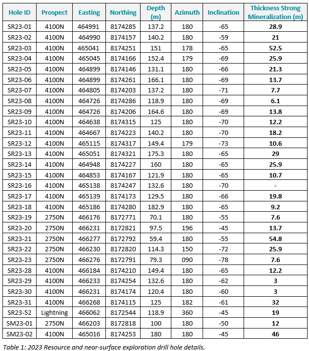 The first batch of assay results from the summer 2023 resource drilling program have been received which includes all drill holes from the 2750N Zone, and five additional drill holes at the 4100N Zone (assays are still pending for the remainder of the 4100N Zone drilling). The resource drilling has included both Reverse Circulation (RC) and shallow diamond drilling in key areas of the near-surface prospects (Table 1).