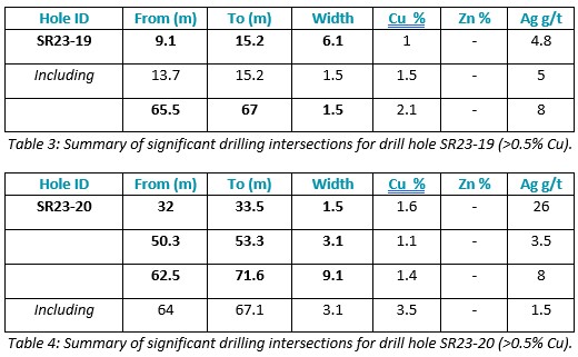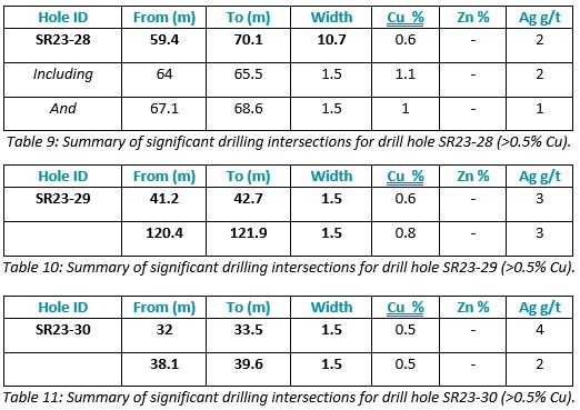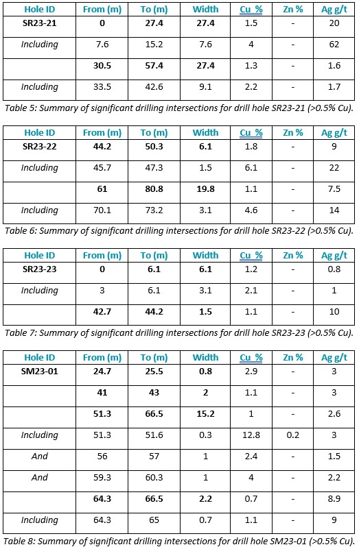 Tables 9 – 13 below summarises the significant intersections in drilling. Intersections are expressed as downhole widths and are interpreted to be approximately 80-100% of true width, and 75-80% for drill hole SM23-02. A cut-off grade of 0.5% copper is used to define a significant intersection and is based on ore mineralogy, mineralization habit and expected beneficiation and processing performance.