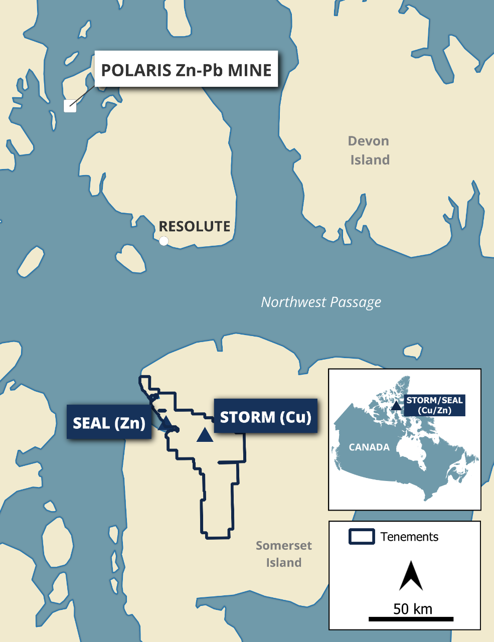 The Nunavut property consists of 173 contiguous mining claims covering an area of approximately 219,257 hectares on Somerset Island, Nunavut, Canada. The Storm Project comprises both the Storm Copper Project, a high-grade sediment-hosted copper discovery (intersections including 110m* @ 2.45% Cu from surface and 56.3m* @ 3.07% Cu from 12.2m) as well as the Seal Zinc Deposit (intersections including 14.4m* @ 10.58% Zn, 28.7g/t Ag from 51.8m and 22.3m* @ 23% Zn, 5.1g/t Ag from 101.5m). Additionally, there are numerous underexplored and undrilled targets within the 120-kilometre strike length of the mineralized trend, including the Tornado copper prospect where 10 grab samples yielded >1% Cu up to 32% Cu in gossans.