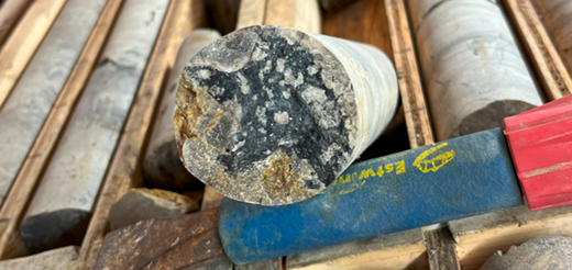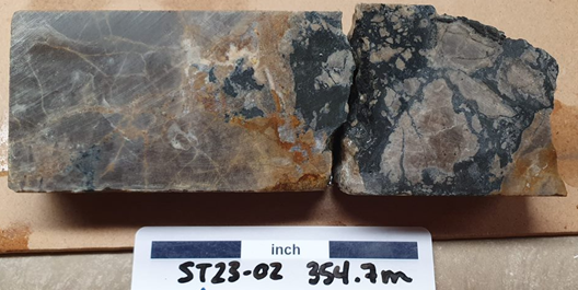 Figure 5: Chalcocite (dark grey) breccia fill in drill hole ST23-02 from approximately 354.7m downhole.