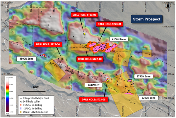 “Every deep exploration drill hole has intersected sulfide mineralization as predicted by both the geological and geophysical models. We clearly have a powerful exploration toolkit for discovery at Storm. Kilometre-scale geophysical anomalies in highly prospective stratigraphy remain untested, and planning has already begun for a major drill program in 2024 to determine the extents of the system and target grade and size.”