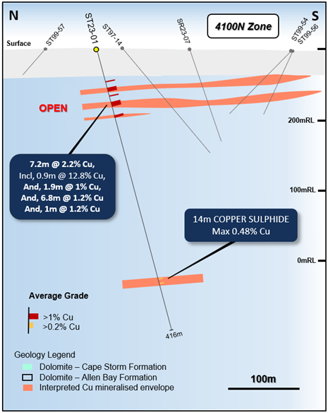 In addition to intersecting the sediment-hosted system at depth, ST23-01 has intersected strong copper intervals within the near-surface 4100N Zone with assays returning: