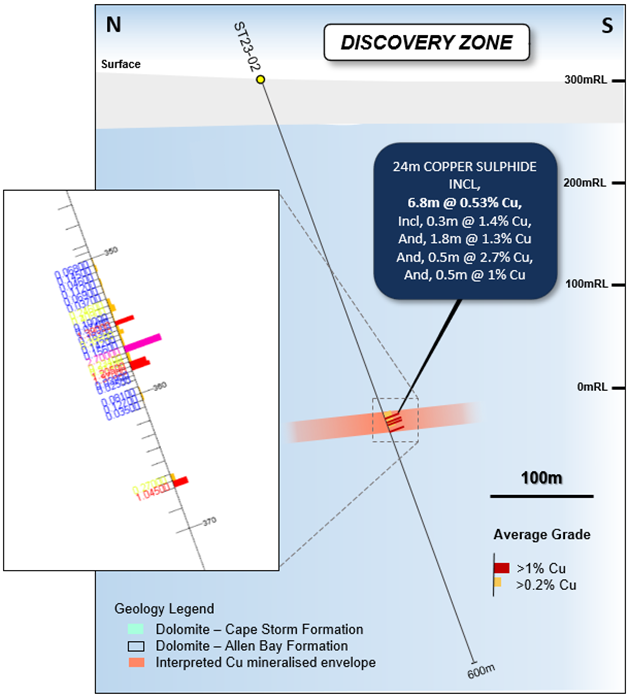 The copper sulfides are hosted within a sequence of organic-rich and vuggy dolomudstones that are visually very similar to ST22-10, ST23-01 and ST23-02. Despite the relatively narrow intervals, the high copper grades are further evidence of the potential of the deeper mineralization to host potentially economic accumulations of copper sulfides.