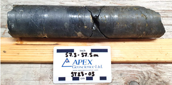 The lower zone of mineralization was intersected at 272.7m downhole and is interpreted to correlate with the sediment-hosted copper mineralization intersected in drill holes ST22-10, ST23-01 and ST23-02. The 2m mineralized interval consists of broad fractures and dense anastomosing veins of chalcocite, bornite and chalcopyrite (Figure 8) with grades up to 1.84% Cu (between 272.7-273.15m).