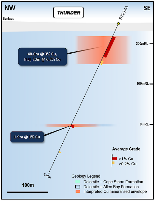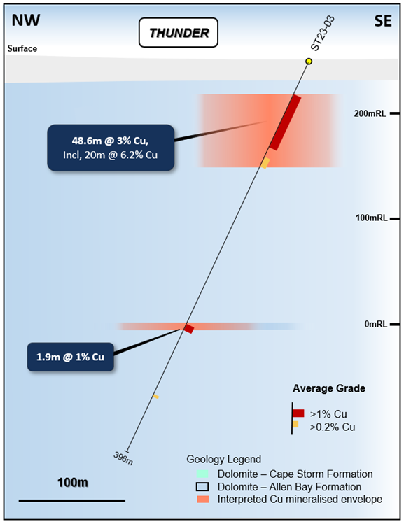 Significantly, all drill holes have intersected copper sulfide mineralization up to 24m thick at the same stratigraphic level, with grades up to 2.7% Cu (ST23-02) indicating the potential of the system to host high-grade mineralization. The copper mineralization and geology within the drill holes is highly similar and suggests that the stratigraphy of the deeper mineralized system is laterally very extensive.