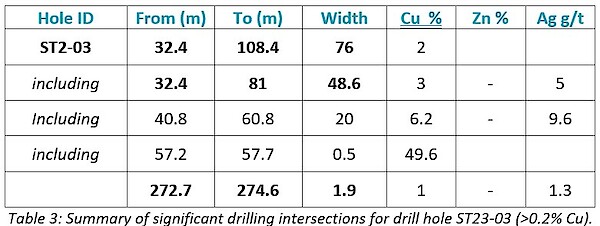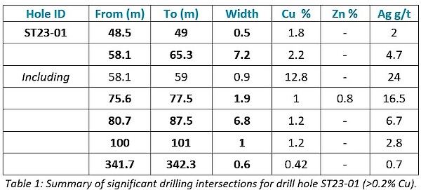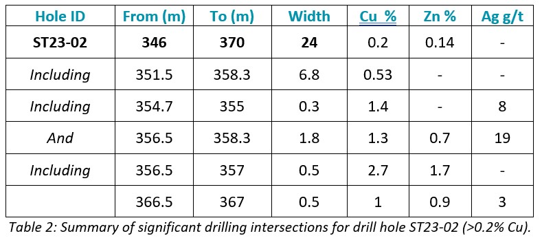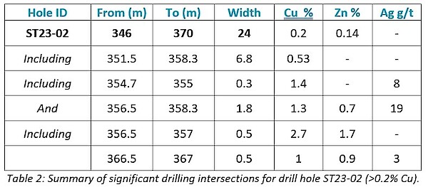 Drill hole ST23-02 was drilled to a downhole depth of 602m and assays have confirmed that it intersected a 24m thick zone of copper mineralization from 346m downhole (Figure 6).