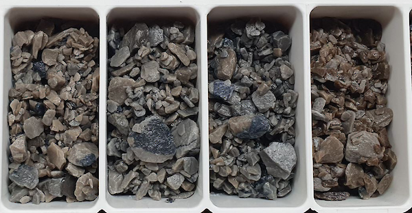 Figure 1: Example of RC chips from drill hole SR23-03 displaying chalcocite (gunmetal grey mineral)