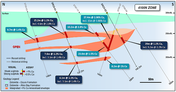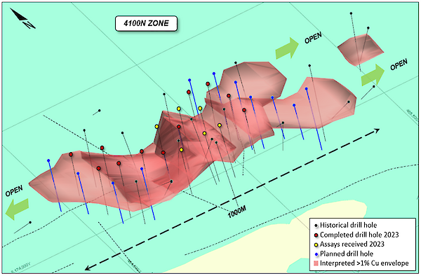 Assay results have been received for an additional five drill holes from the current program at the 4100N Zone, and all have intersected thick intervals of near-surface copper sulfides with grades up to 7% Cu. The assays continue to match or exceed visual estimations as previously reported.