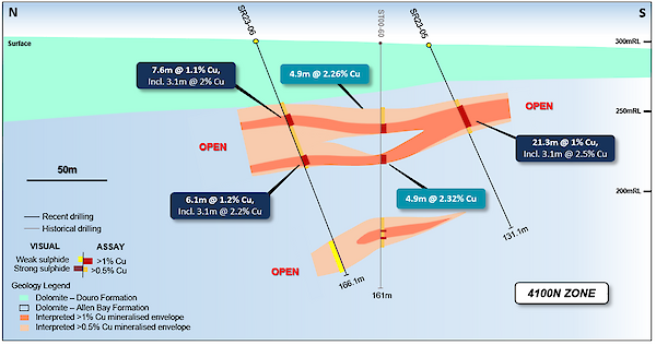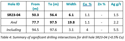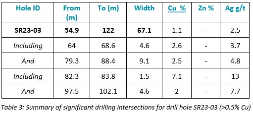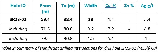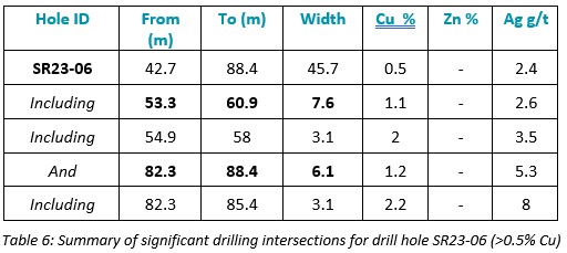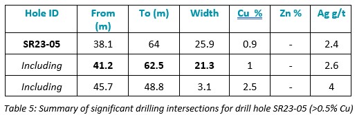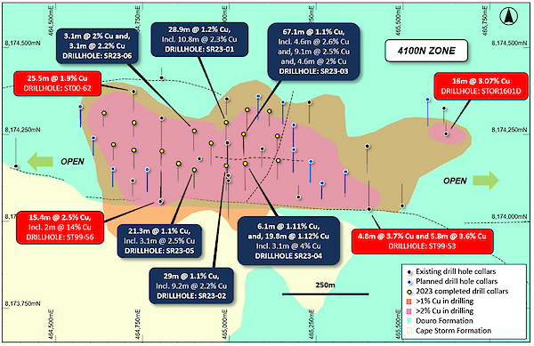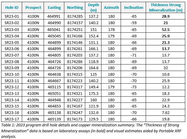 Assay results from drill holes SR23-02, SR23-03, SR23-04, SR23-05 and SR23-06 have been received and confirm thick intervals of near-surface copper sulfides within the 4100N Zone.