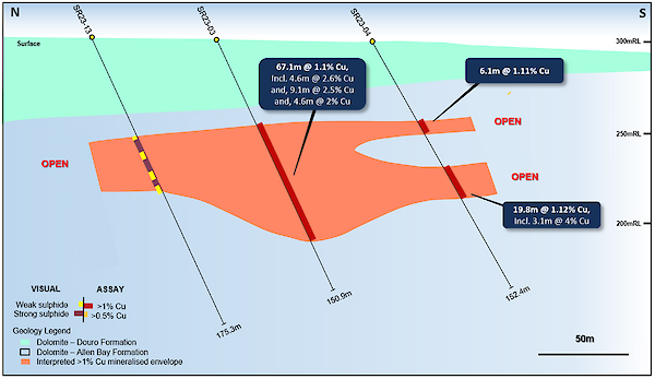 The drilling results received to date demonstrate consistent copper grades and excellent lateral continuity of the high-grade mineralization. Additionally, drilling results show significant thicknesses of coherent copper mineralization (<1% Cu) are present outside of the stronger zones of mineralization.
