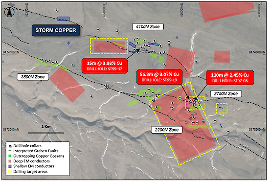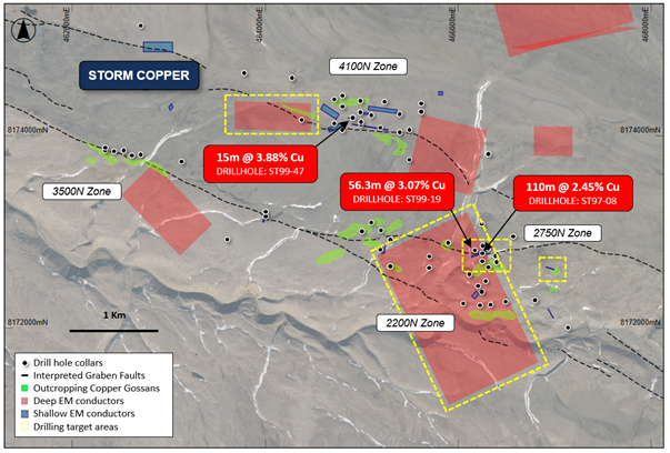 “Storm has more than 14,000 metres of historical drilling with significant high-grade copper intercepts. The current program is designed to unlock the value of these intercepts by moving toward a resource that could support a mining proposal, as well as by expanding on these known areas of mineralization. We will also continue to drill for discovery in unexplored areas, targeting untested anomalies that may represent sizable zones of undiscovered high-grade copper mineralization.”