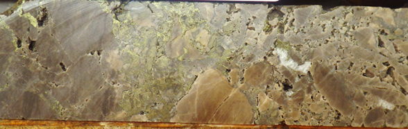 Figure 1: Chalcopyrite (copper sulfide) within ST22-10 drill core from 313m downhole. Chalcopyrite is the metallic yellow mineral within tan/grey dolostone/limestone.
