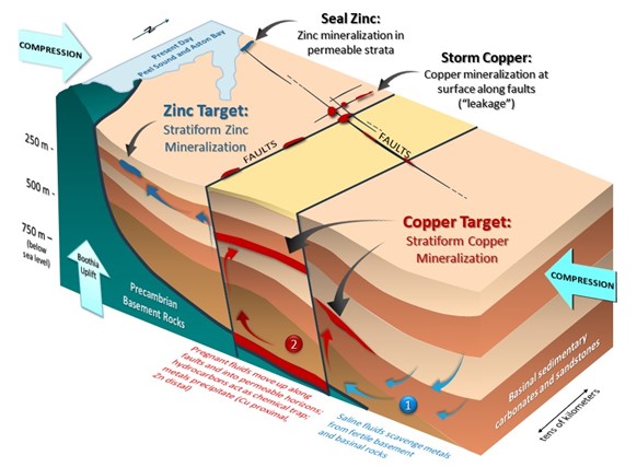 Figure 2: Schematic exploration concept of the Storm/Seal Projects. Drill hole ST22-10 has intersected mineralization interpreted to be associated with the area labelled as Copper Target: Stratiform Copper Mineralization.