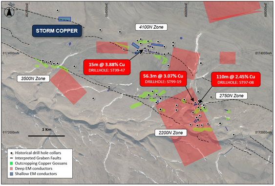 Importantly, the new EM anomalies are located proximal to the known bounding faults of the Storm graben, which are interpreted controls on the copper mineralization at Storm.