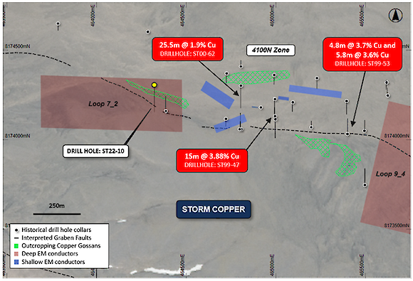 This newly discovered mineralization and setting at Storm shares features very similar to many large volume, sedimentary hosted copper systems. Importantly, ST22-10 is the first hole to intersect one of the deeper EM anomalies modelled from the 2021 FLEM survey with six other similar EM plates yet to be tested, indicating the potential for a large-scale mineral system.