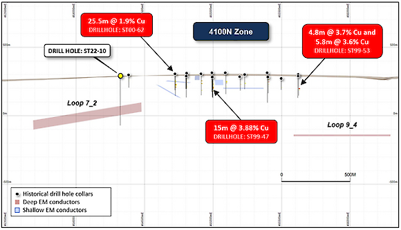 Conductor Loop7_2 (see Figure 4) is a large conductive feature (modelled as 800 x 300m, depth ~250m, conductivity thickness 10). This target was prioritized for drilling as its eastern extent appeared to project upwards towards the 4100N Zone, where previous high-grade intersections include 15m* @ 3.88% copper (Cu) from 72.4m (drill hole ST99-47), and therefore presented as a compelling target.