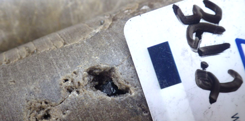 Figure 1: Chalcopyrite (copper sulfide) within ST22-10 drill core from 313m downhole.