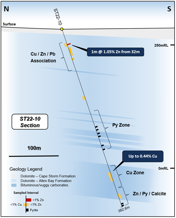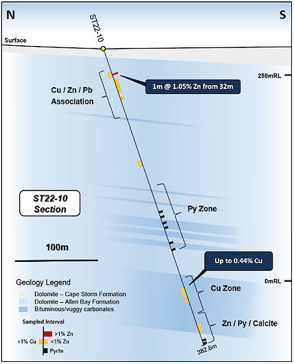 Approximately 68.8 metres (m) of chalcopyrite, pyrite and sphalerite mineralization were intersected from 277m downhole in drill hole ST22-10 (approx. 230m vertical depth). The mineralization is interpreted to be stratabound and is hosted within a vuggy, bituminous and fossiliferous carbonate unit.