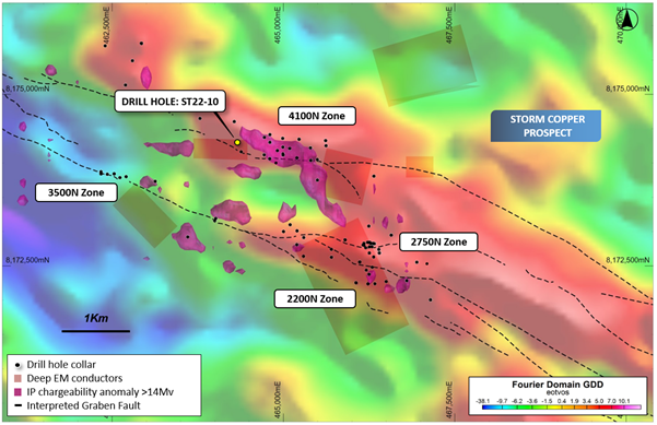 ST22-10 is the deepest drill hole completed at the Storm Project this season and highlights the outstanding exploration potential of the project area. Compilation of historical induced polarization (IP), gravity and EM data reveals a series of large anomalies that sit below, and/or adjacent to the known near-surface high-grade copper mineralization and graben fault system.