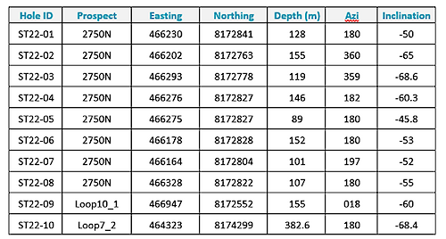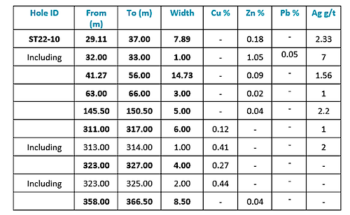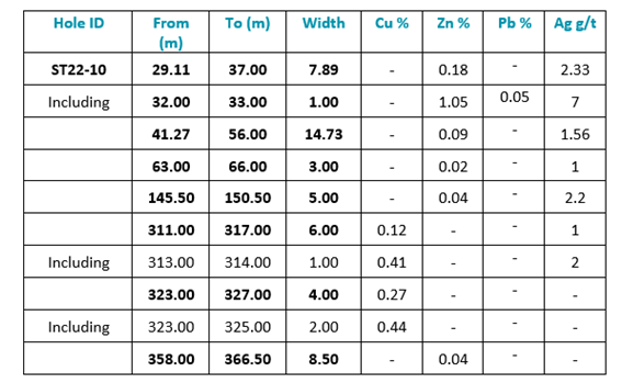 Table 1: Summary of significant drilling intersections for drill hole ST22-10 (>0.1% Cu, >0.01 Zn) Note – these cut-off grades reflect the exploratory nature of the drilling and are designed to indicate anomalous values.