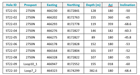 Visual observations of chalcopyrite and sphalerite in the drill core have now been confirmed by assays within the sampled intervals from ST22-10.