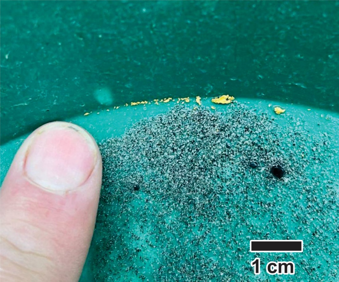 Figure 1: Composite gold-in-stream sample from several panned samples showing textural and size characteristics of gold grains panned on the property, from fine-grained flakes to coarse, angular grains.