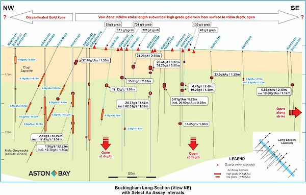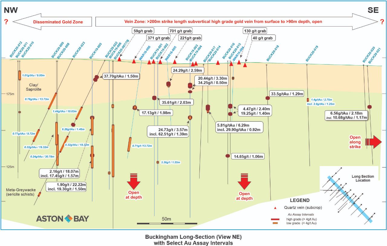 Discovered at surface by prospecting in 2015 following up on a gold anomaly from a 1996/97 stream sediment survey, the NW-SE trending Buckingham Gold Vein is a subvertical mesothermal-style gold vein that outcrops at surface and has been intercepted in drill core at greater than 90 metres (m) in depth and over 200m along strike. Select significant gold intercepts from 2019 and 2020 Aston Bay drill programs are presented in Table 1, including drill core intervals of 35.61 grams per tonne (g/t) Au over 2.03m, 20.44 g/t Au over 3.30m and 34.25 g/t Au over 0.5m, and 24.73 g/t Au over 3.57m including 62.51 g/t Au over 1.39m.  A longitudinal drill section showing select significant intervals is presented in Figure 2 (see also October 10, 2020 Aston Bay press release). The vein is open at depth and along strike to the SE. Follow-up drill programs to investigate the down-dip and along-strike potential are anticipated for 2022.