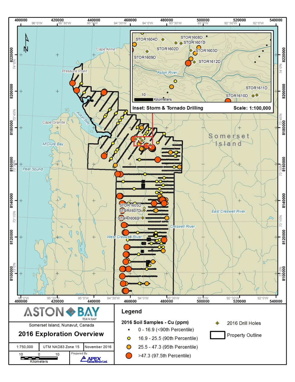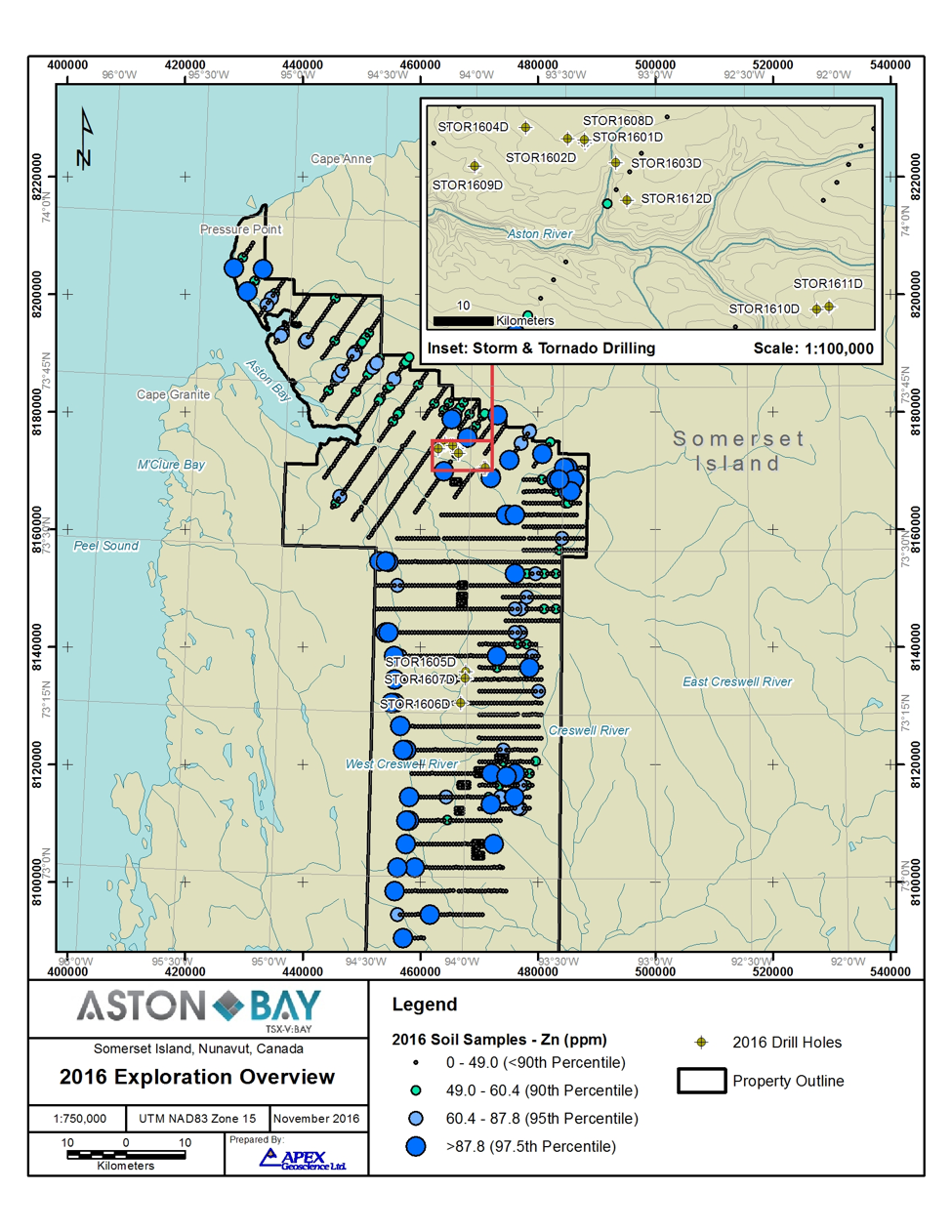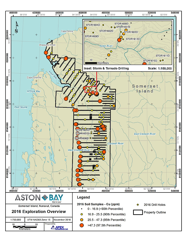 Toronto, Canada – January 24, 2017 – Aston Bay Holdings Ltd. (TSX-V: BAY) (“Aston Bay” or the “Company”) is pleased to announce that the Company has received complete geochemical results for the summer soil sampling program at the Storm Property (“Storm”), Somerset Island, Nunavut. The Company collected 2,005 soil samples over an area of approximately 120 km north-south and 20 to 40 km east-west on the property. The samples were analysed for multi-element geochemistry at ALS Minerals of Vancouver B.C. Analytical results for copper are presented in Figure 1; results for zinc are presented in Figure 2.