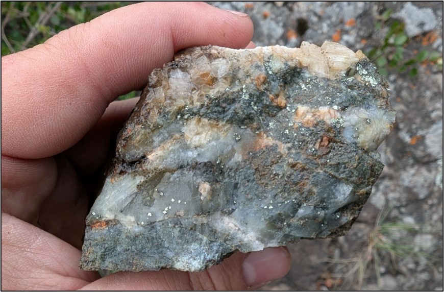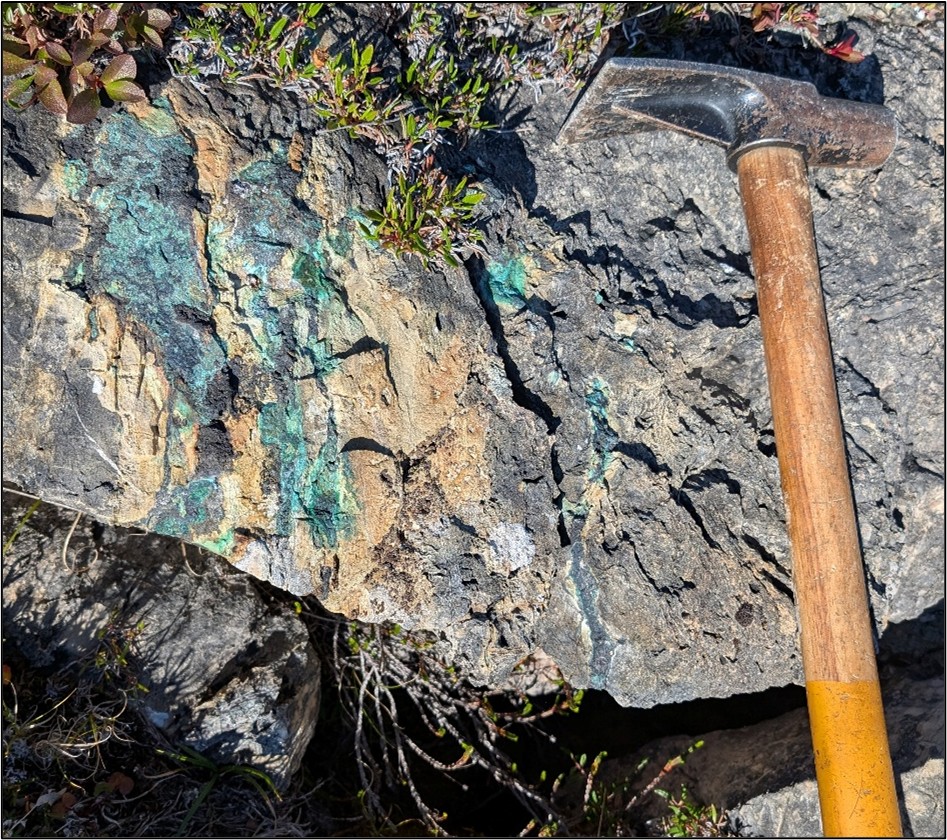 Figure 3: Disseminated chalcopyrite-bornite at the Expert Showing, yielding up to 5.42% Cu and 1.89 g/t Au. Chalcopyrite is the yellow metallic mineral, with bornite (purple-blue), with surficial recent weathering to green malachite.