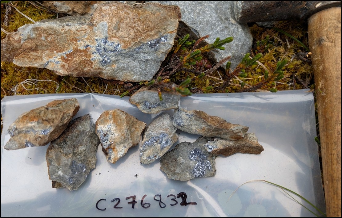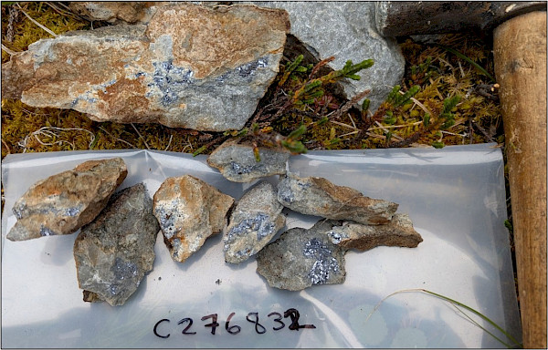 Figure 4: Quartzite boulders with disseminated chalcopyrite-bornite at the Clastic Showing, up to 3.7% Cu and 2.08 g/t Au.