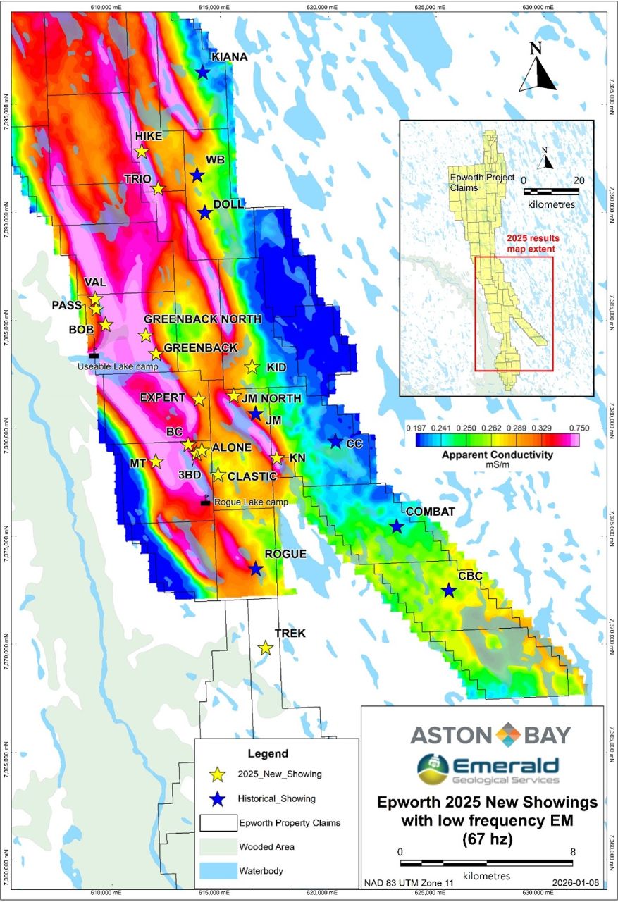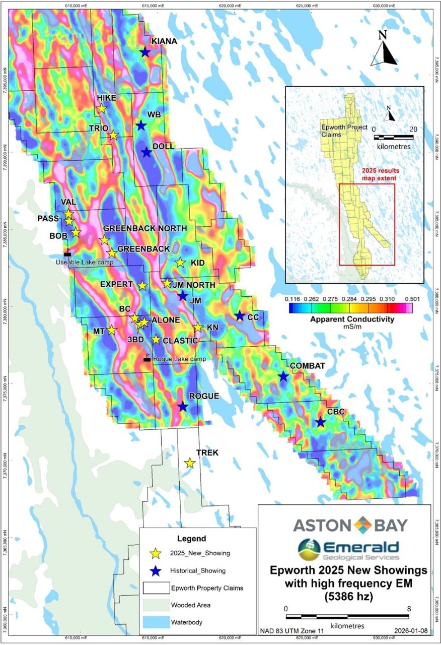 “We are extremely pleased to discover multiple base and precious metal showings during the 2025 mapping and prospecting program in the southern portion of the property, an area that had seen little previous exploration,” stated Thomas Ullrich, CEO of Aston Bay.