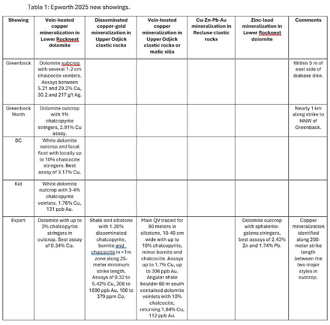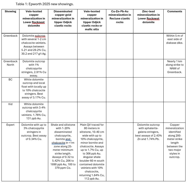 Of the styles of mineralization encountered in the 2025 field program, the highest copper and silver values were returned from vein-hosted copper mineralization in Lower Rocknest dolomite, present at the Greenback, Greenback North, BC, Kid and Expert Showings, with Greenback returning 29.2% Cu with 217 g/t Ag in chalcocite veinlets (Figures 1 and 2). The Greenback Showing is similar in character to the Payback Cu-Ag showings in the northern part of the property, which originally returned up to 61% Cu and 5600 g/t Ag (Payback South Showing, see March 1, 2024, Aston Bay news release). Both are spatially associated with diabase dikes and with MobileMT conductance anomalies.