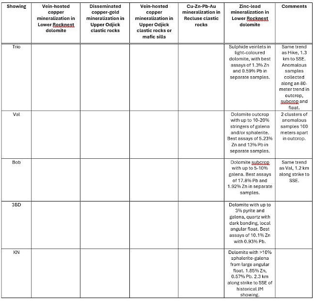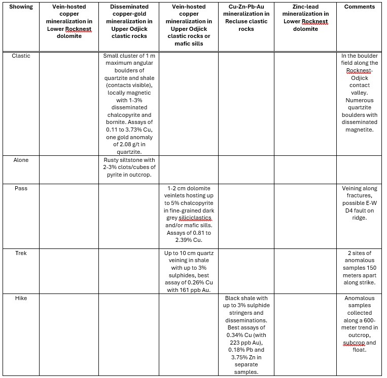 Many of the major new showings show good spatial correlation with both low- and high-frequency conductors. Expert, Alone, and Clastic are more marginal to the conductors, but their location is on the east margin of a syncline that dips towards the conductors. Most showings also occur along or proximal to the Rocknest-Odjick contact, as has been observed elsewhere on the Property.