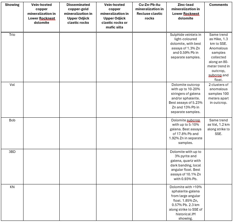 The showings, sampled from outcropping, subcropping (broken but deemed in place) rock and local boulders, are described in Table 1 and categorized by the styles of mineralization present. Of 309 select grab samples, 22 yielded ≥1% Cu, 22 samples yielded > 5 g/t Ag, 16 samples yielded >1% Zn, and 7 samples yielded >0.5 g/t Au. See Figure 1 for location and select grab sample results for each showing. Follow this link for copper, zinc, silver, gold, cobalt and lead results mapped thematically.