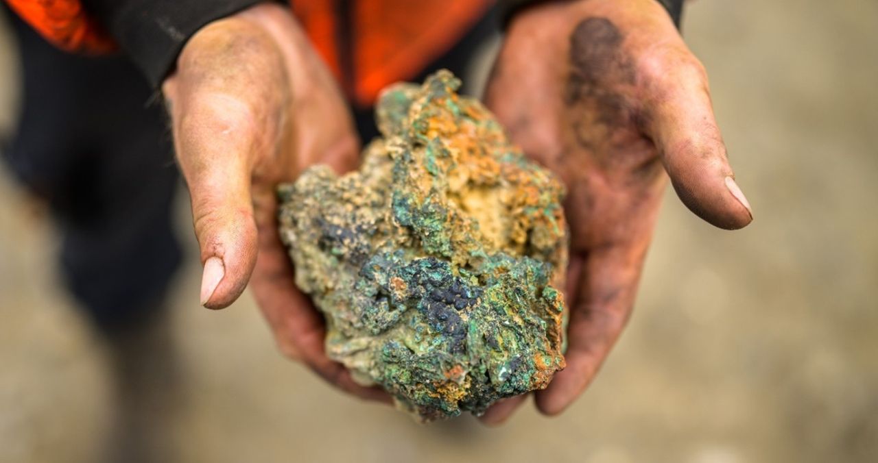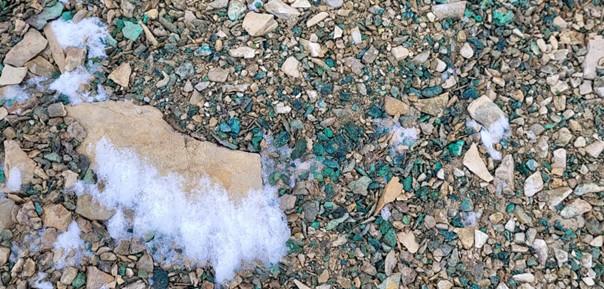 Figure 1: A photo of interpreted copper sulfides/oxides (green) on the surface at the Chinook Deposit, Storm Project, Nunavut. The material has not been assayed.