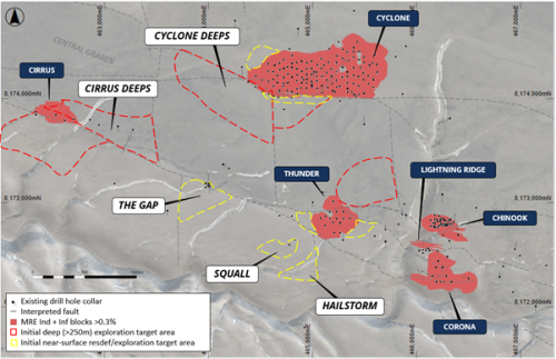 The first diamond drill targets to be tested in the Storm MRE area are Cirrus Deeps and Cyclone Deeps (Figure 2). The drilling aims to follow up earlier intersections of high-grade copper mineralization and build evidence for the large-scale copper potential at depth, which could rapidly expand the copper endowment within the Storm MRE area.